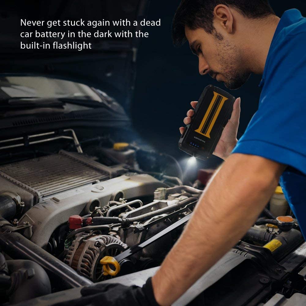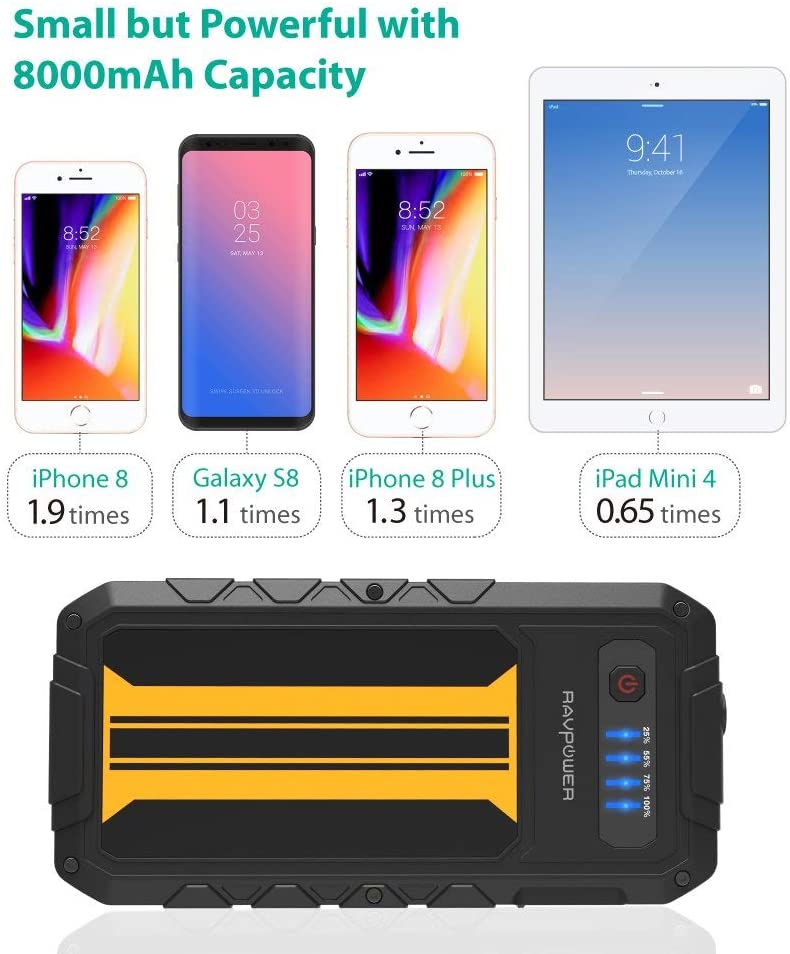 - Double as a Compact Power Bank: When you are not using this portable jumper to start a dead car, you can use it to power up your mobile devices, as it comes with 8000mAh battery life, which is enough to charge an iPhone 7 around 1.7 times and Samsung Galaxy S8 around 1.1 times. This compact jumper may not fit in your pocket, but it is perfect for your glove compartment.